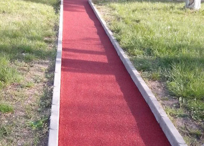 Современные дорожки и тропинки все чаще делают с помощью резиновых рулонных покрытий. Этот материал обладает рядом существенных преимуществ: